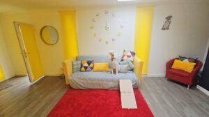 Home-Comfort Lounge — sofa, rug & enrichment toys.